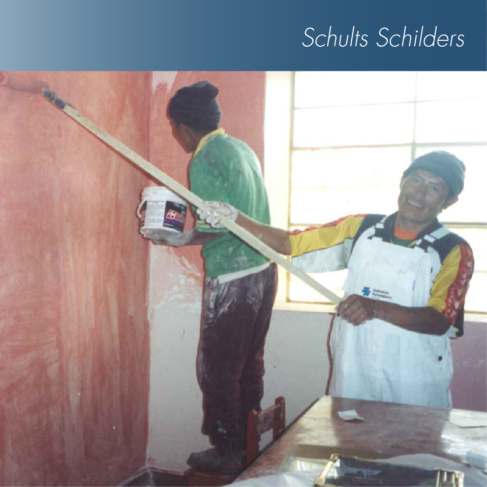 “Ook ‘Schults Schilders’ uit Zierikzee doet graag aan maatschappelijk onderhoud! We hebben onder andere geld verzameld, ook bij vrienden, om twee klaslokalen en een kantoor te laten schilderen door een boerengemeenschap in Peru. Wij stelden zowel de verf beschikbaar als ook glas om kapotte ramen te repareren. Daarnaast deelden we 180 kerstpakketen uit en 360 kinderen kregen een kerstontbijt en klein speelgoed.”