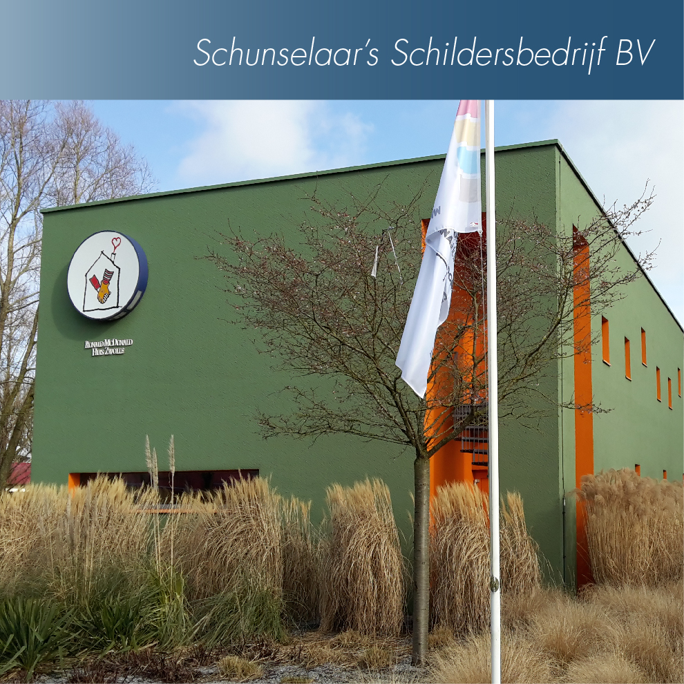 “Ook ‘Schunselaars Schildersbedrijf’ te Zwolle doet graag aan maatschappelijk onderhoud! Sinds tien jaar verzorgen wij geheel belangeloos het buitenschilderwerk voor het Ronald McDonaldhuis in Zwolle. Voor de uitvoering hebben we een meerjaren onderhoudsplan opgesteld. Gedurende deze periode zorgen we voor een goede onderhoudsstaat. Dat is onze bijdrage voor de ouders, die met een eigen verblijf zo dicht mogelijk bij hun zieke kind kunnen zijn.”