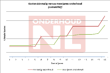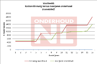 In de grafiek ziet u een voorbeeld van het verloop van de kosten bij eenmalig onderhoud en bij meerjaren onderhoud. Een meerjaren onderhoudsschema is uiteindelijk goedkoper en duurzamer dan het op ad hoc basis laten schilderen van uw woning. Afhankelijk van het gekozen schema en materialen kan dit voordeel oplopen tot wel 25% !